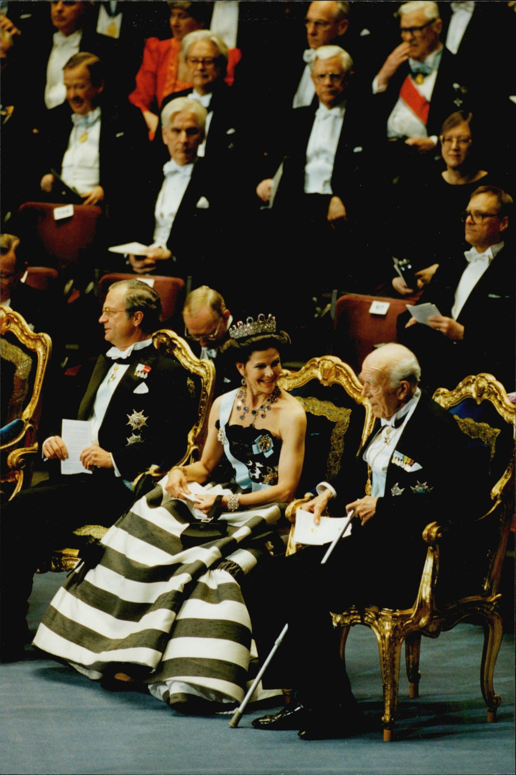 Nobel prize ceremony in the concert hall. On the stage King Carl Gustaf, Queen Silvia and Prince Bertil Queen Silvia, Nobel Dinner, Nobel Bankett