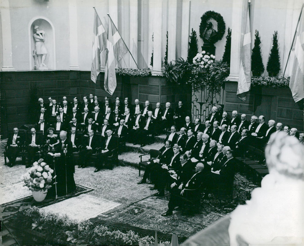 Nobel prize winners on the podium at the award ceremony in the concert hall's grand hall - Vintage Photograph