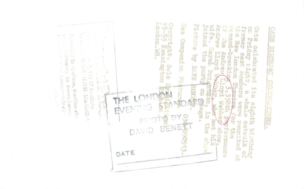 Singer Sarah Brightman and composer Andrew Lloyd Webber on stage at the musical Cats 8th anniversary at the New London Theater - Vintage Photograph