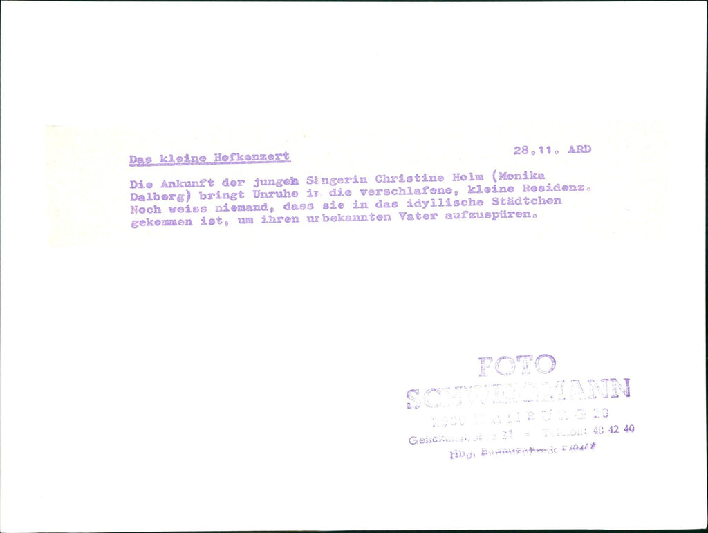 The arrival of the young singer Christine Holm (Monika Dahlberg) brings unrest to the sleepy, small residence. Nobody knows yet that she has come to the idyllic town to track down her unknown father. Die Ankunft der jungen Sängerin Christine Holm (Monika Dahlberg) bringt Unruhe in die verschlafene, kleine Residenz. Noch weiß niemand, dass sie in das idyllische Städtchen gekommen ist, um ihren unbekannten Vater aufzuspüren.