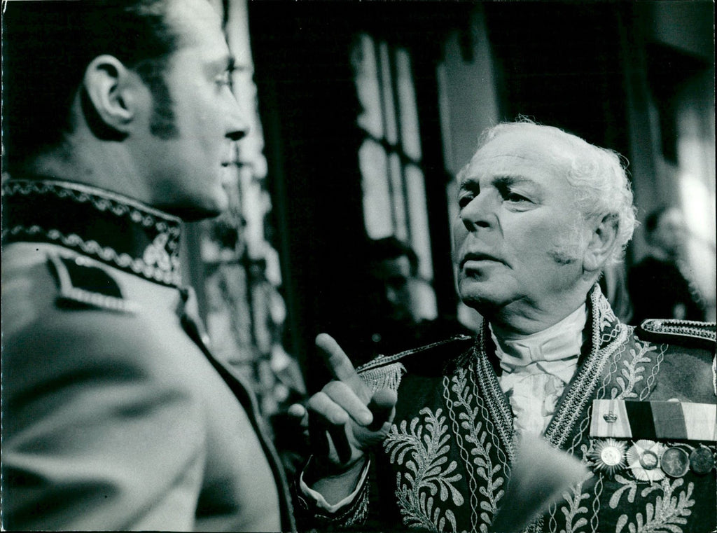 The photo shows Serenissimus, played by Fritz Schulz, and Walter von Arnegg, played by Werner Bruhns. Serenissimus beauftragt ausgerechnet den Leutnant Walter von Arnegg mit der Durchführung der Ausweisung der in der Stadt unerwünschten Sängerin. Der Leutnant ist verliebt in die Sängerin. (Fritz Schulz, r. und Werner Bruhns, l.)