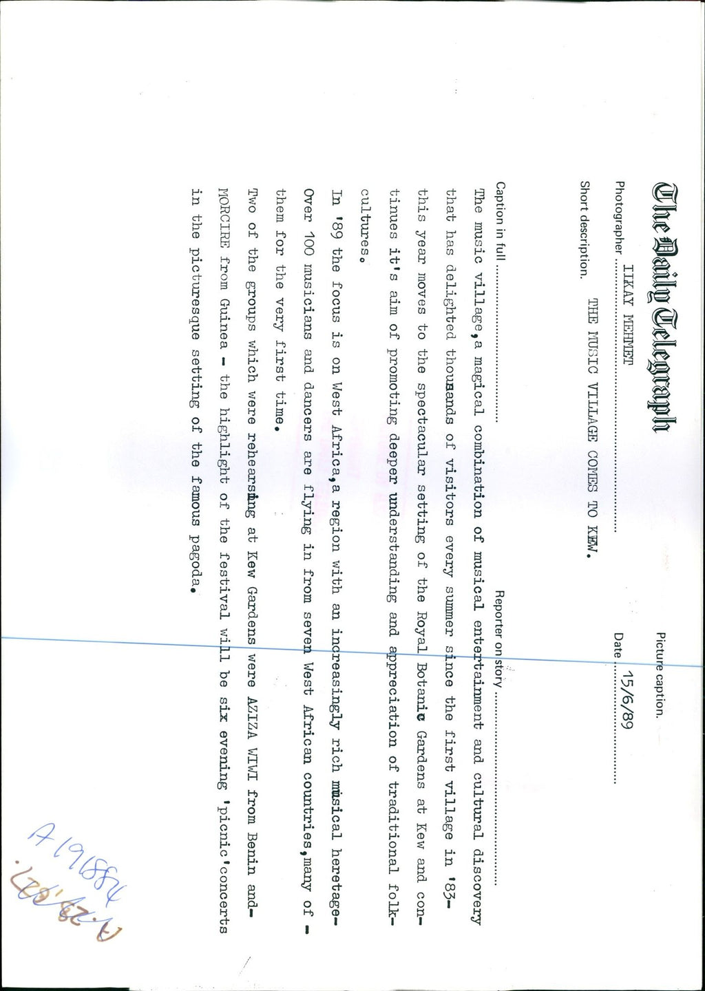 The music village is a magical combination of musical entertainment and cultural discovery that has delighted thousands of visitors every summer since the first village in '83. In '89 the focus is on West Africa , a region with an increasingly rich musical heretage. Over 100 musicians and dancers are flying in from seven West African countries , many of - them for the very first time. The music village is a magical combination of musical entertainment and cultural discovery that has delighted thousands of visitors every summer since the first village in '83. In '89 the focus is on West Africa , a region with an increasingly rich musical heretage. Over 100 musicians and dancers are flying in from seven West African countries , many of - them for the very first time.