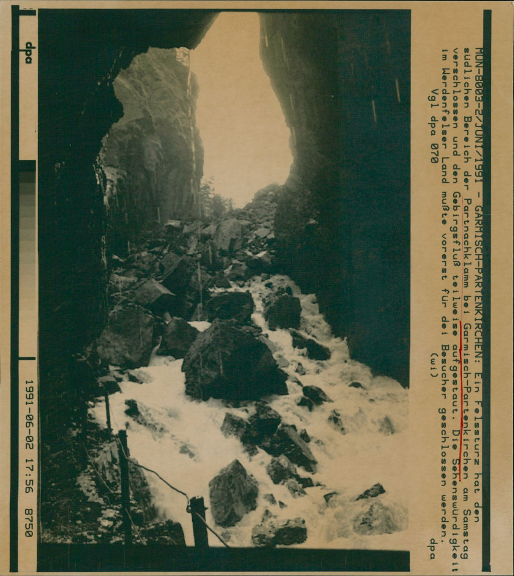 1991 ROCK FALL HAS CLOSED AREA PARTNACHKLAMM GARMISCH Ein Felssturz hat den südlichen Bereich der Partnachklamm bei Garmisch-Partenkirchen verschlossen und den Gebirgsfluss teilweise aufgestaut.