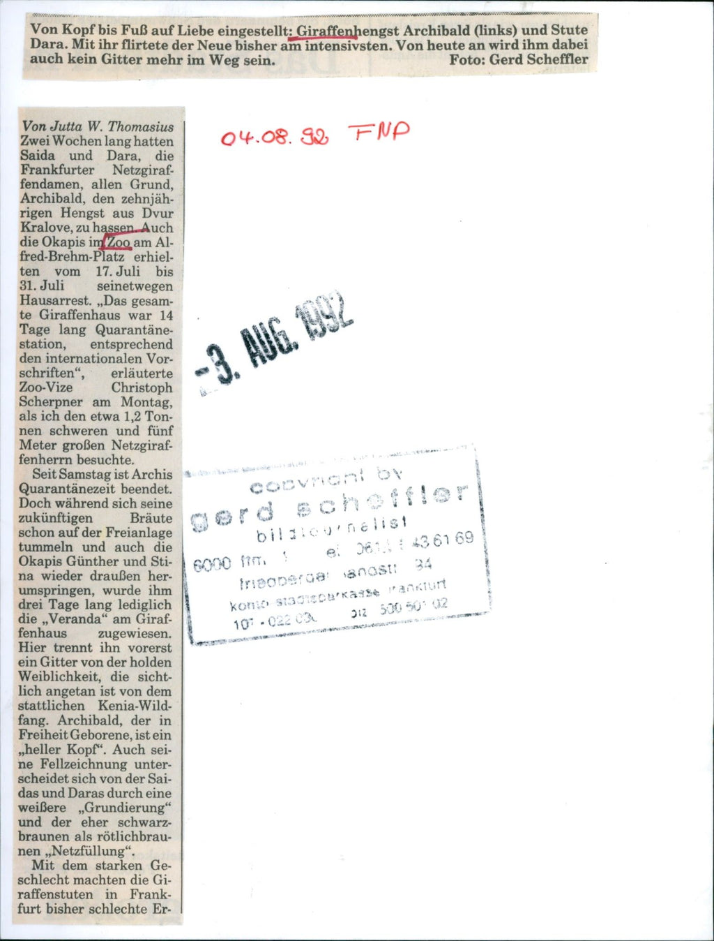 1992 GIRAFFE STALLION ARCHIBALD TENYEAROLD Giraffenhengst "Archibald" (l.) und Stute "Dara" zeigen sich verliebt im Frankfurter Zoo.