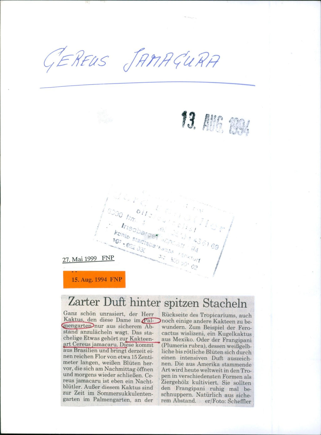 May 27, 1999: Tender scent behind pointed spikes. Unspased unshaven, the Lord back of the tropicarium, also cactus, which this lady in the lalnoch some other cactuses to Bemen garden only from a secure distance he / Photo: . takes. The dusty something belongs to the cactus style Cereus Jamacaru. This is currently in the summer coupling garden in the palm garden, on the right side of the path office. 27. Mai 1999: Zarter Duft hinter spitzen Stacheln. Ganz schön unrasiert, der Herr Rückseite des Tropicariums, auch Kaktus, den diese Dame im Lalnoch einige andere Kakteen zu bemen- garten nur aus sicherem Abstand er/Foto: . igen nimmt. Das staubige Etwas gehört zur Kakteen- Art Cereus jamacaru. Diese kommt zur Zeit im Sommersukkulenten- garten im Palmengarten, an der rechten Seite des Wegebüros.