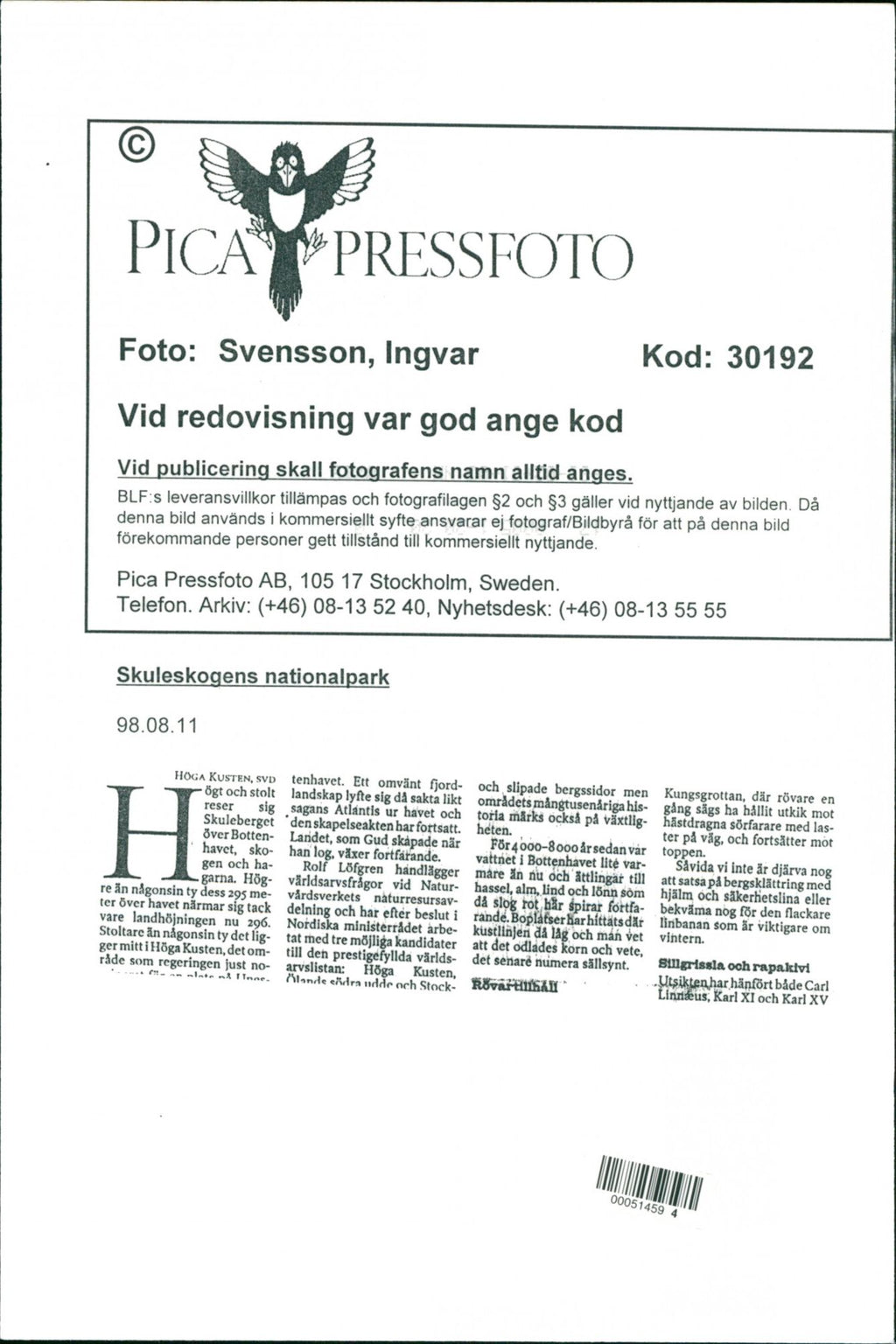 1998 NATURE RESERVED PROTECTED TELEPHONE NATIONAL SWEDEN PICA - Vintage Photograph
