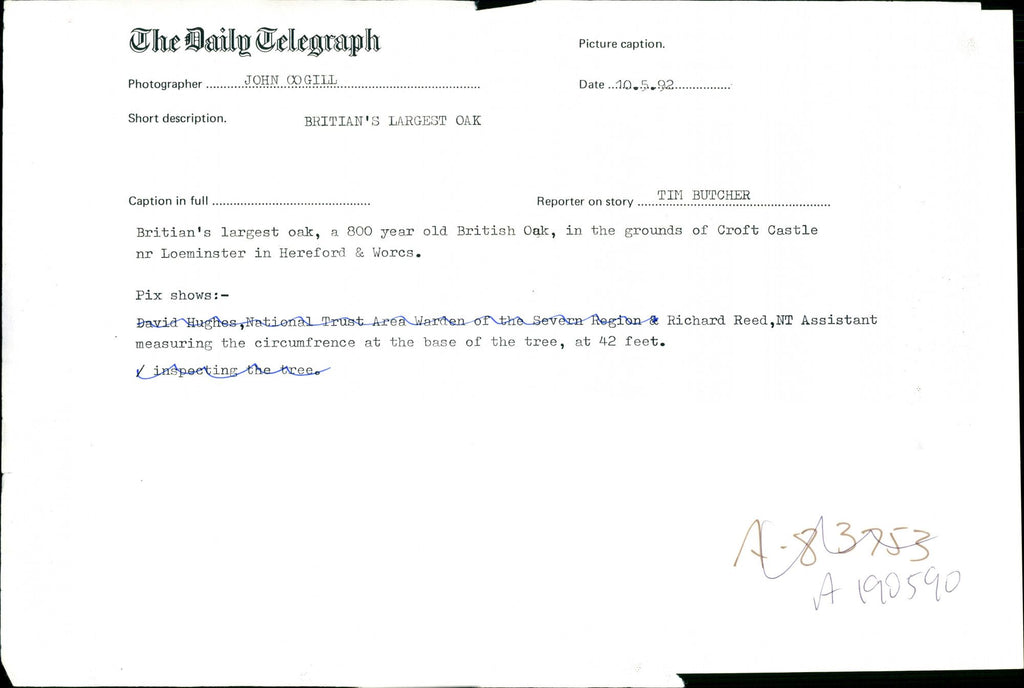 Britain's largest oak, a 800 year old British Oak, in the grounds of Croft Castle near Leominster in Herefordshire. Richard Reed, NT assistant measuring the circumference at the base of the tree. Britain's largest oak, a 800 year old British Oak, in the grounds of Croft Castle near Leominster in Herefordshire. Richard Reed, NT assistant measuring the circumference at the base of the tree.