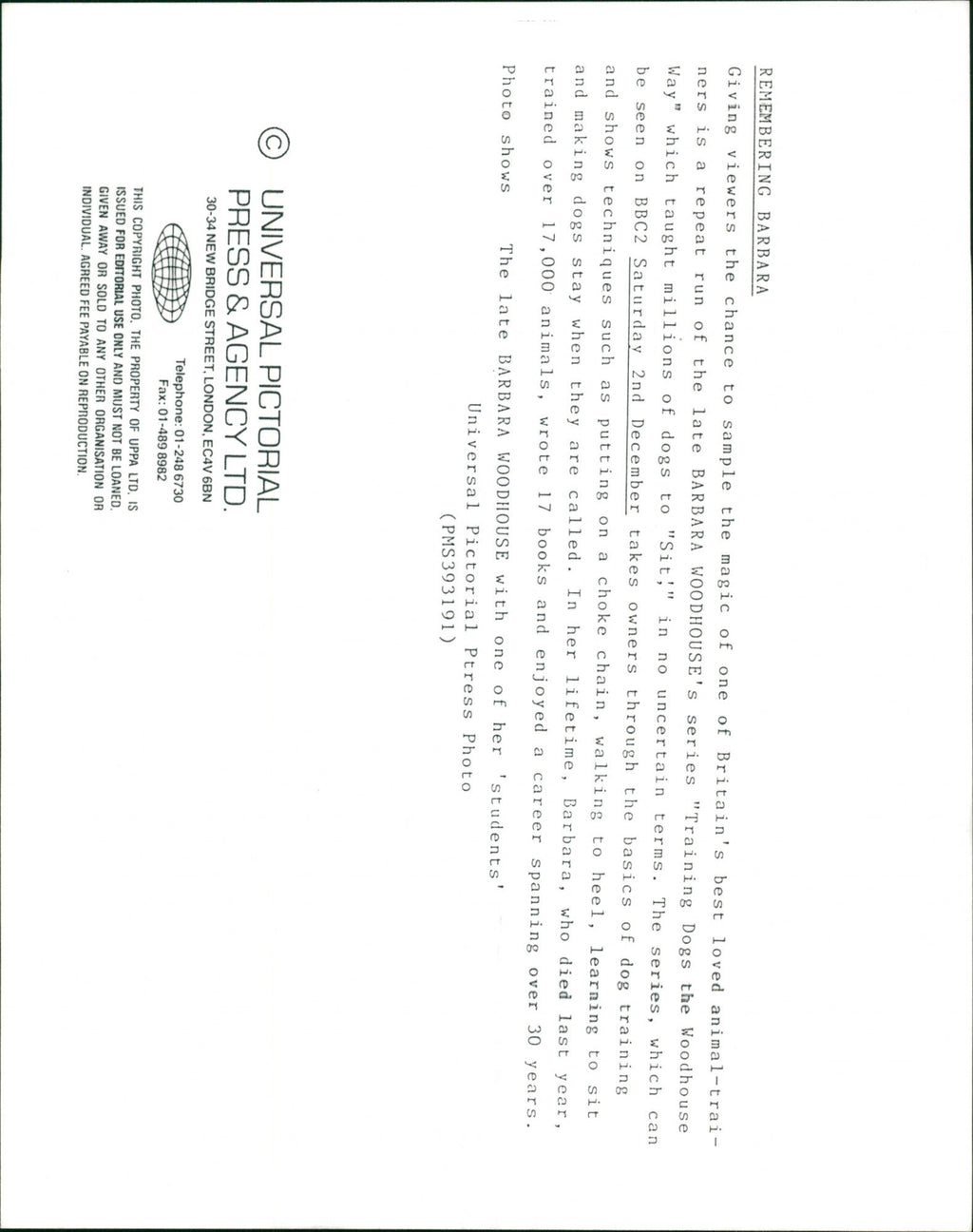 Barbara Kathleen Vera Woodhouse was a dog trainer, author, horse trainer and television personality. Barbara Kathleen Vera Woodhouse was a dog trainer, author, horse trainer and television personality.