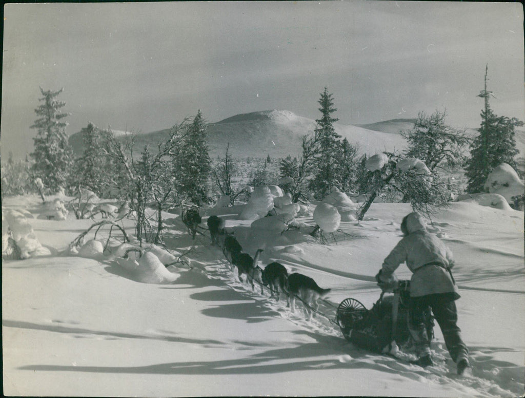 Dog sled and rider in a snowy landscape - Vintage Photograph