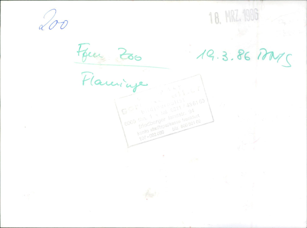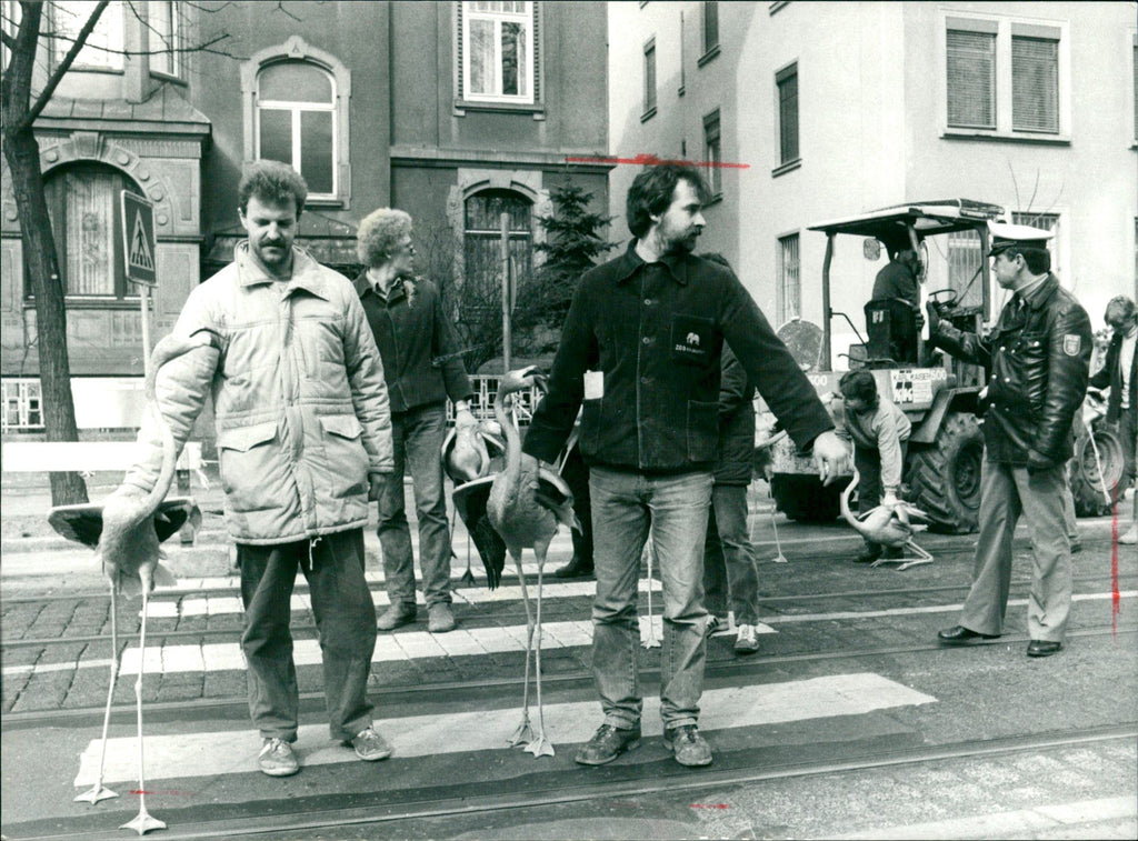 The staff of the Frankfurt Zoo cross the street with their flamingos. In the background a traffic policeman.