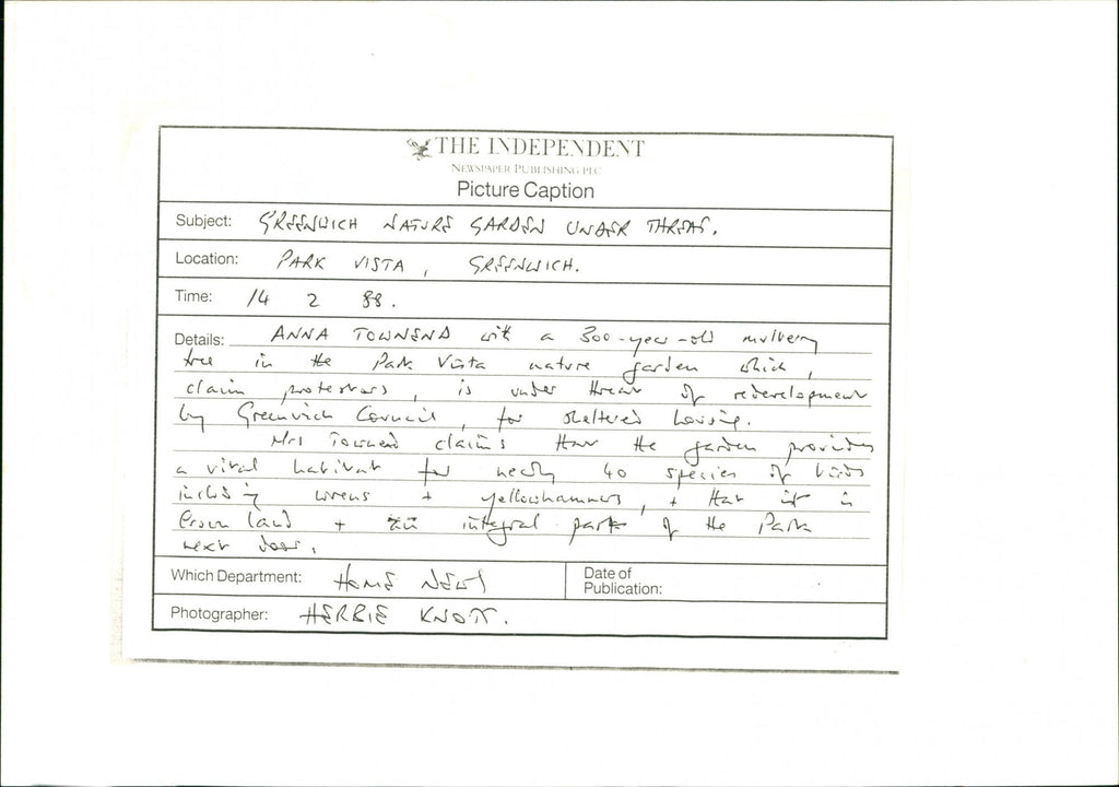 The Independent Newspaper Publishing PLC Picture Caption, Subject: Greenwich Nature Garden Under Threat. Location: Park Vista, Greenwich, Time: 14 2 1988.Details: Anna Townsend with a 300-year-old mulberry tree in the Park Vista Nature Garden which, claim protestors, is under threat of redevelopment by Greenwich Council, for Sheltered housing. Mrs Townsend claims that the garden providing vital habitat for nearly 40 species of birds including wrens & yellowhammers, & that it is Crown land and integral part of the part next year. Which Department: Home News, Photographer: Herbie Knott