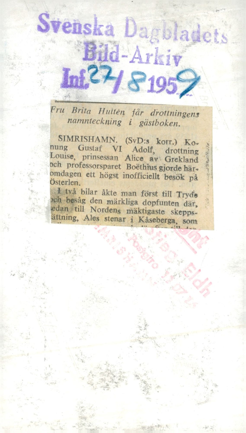 King Gustaf VI Adolf and Queen Louise write their signature in the guestbook that Brita Hultén holds. - Vintage Photograph