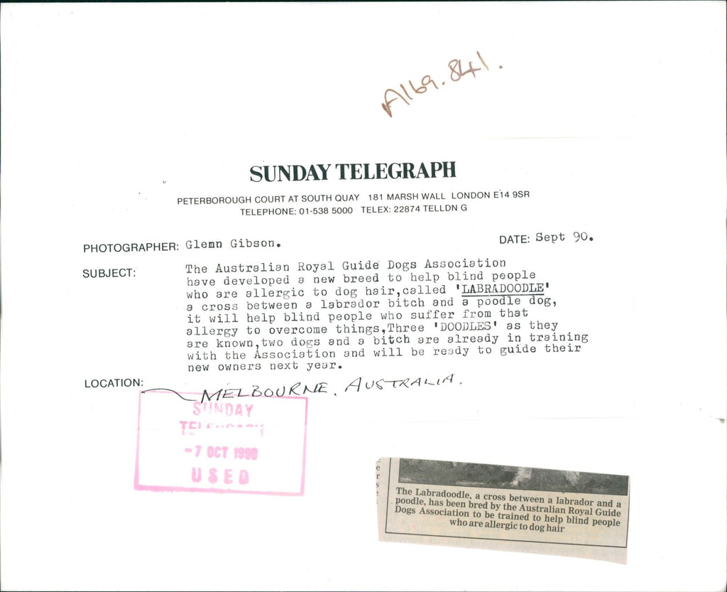 A labradoodle is a crossbreed dog created by crossing the Labrador Retriever and the Standard, Moyen or Miniature Poodle. The term first appeared in 1955, but was not popularized until 1988, when the mix began to be used as an allergy friendly guide dog. A labradoodle is a crossbreed dog created by crossing the Labrador Retriever and the Standard, Moyen or Miniature Poodle. The term first appeared in 1955, but was not popularized until 1988, when the mix began to be used as an allergy friendly guide dog.