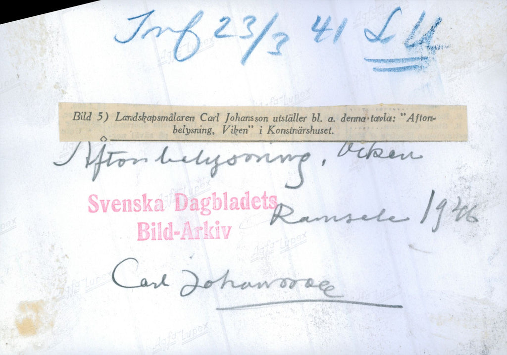 Landscape painter Carl Johansson's painting "Evening Light, Viken". Exhibition of Artist House - 23 March 1941 - Vintage Photograph