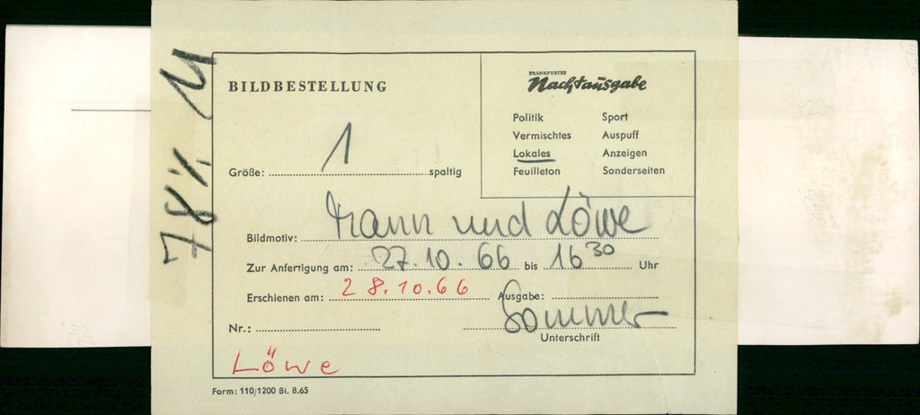 The photo shows a man with a lion. Das Foto zeigt einen Zooarbeiter mit einem Löwe im Frankfurter Zoo.