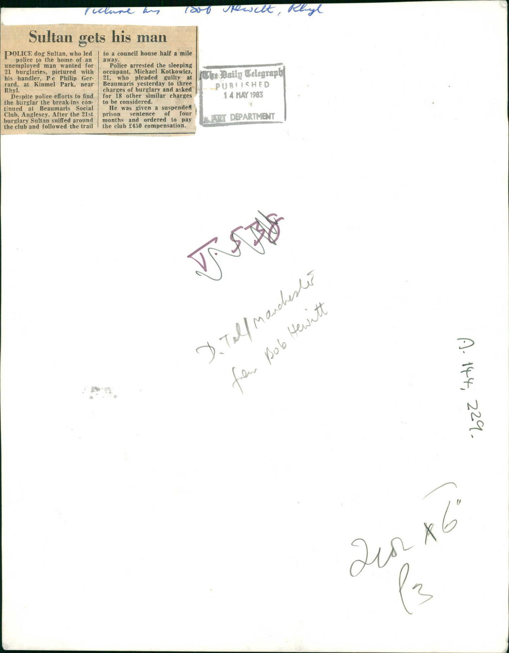 police dog Sultan, who led police to the home of an unemployed man wanted for 21 burgalaries, pictured with his handler, Pc Philip Gerard at Kinmel Park, near Rhyl. police dog Sultan, who led police to the home of an unemployed man wanted for 21 burgalaries, pictured with his handler, Pc Philip Gerard at Kinmel Park, near Rhyl.