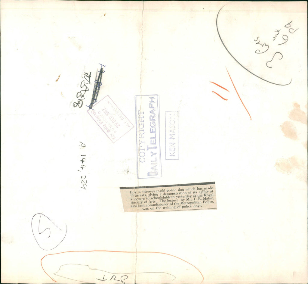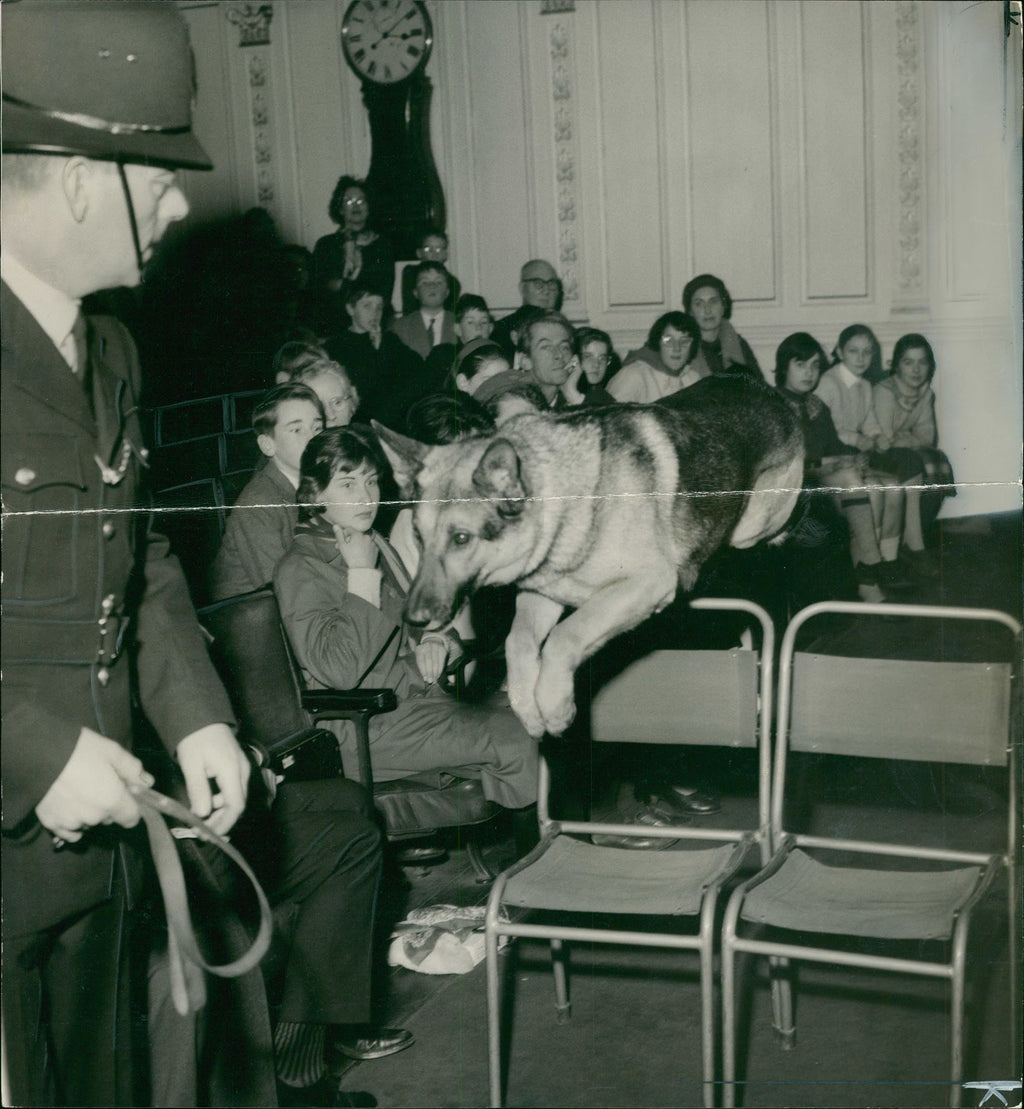 Boy, a three year old police dog which has made 13 arrest, giving a demonstration of its agility at a lecture to schoolchildren yesterday at the Royal Society of Arts. Boy, a three year old police dog which has made 13 arrest, giving a demonstration of its agility at a lecture to schoolchildren yesterday at the Royal Society of Arts.