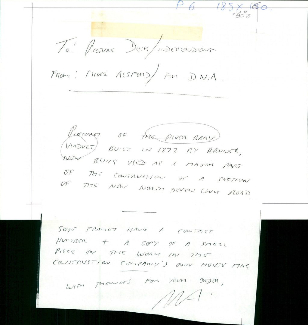 To: Picture Desk / Independent. From Mike Alsford / For D.N.A., Pictures of the River Bray Viaduct built in 1872 by Brunel, now being used as a major part of the construction of a section of the new North Devon Link Road. Some frames have a contact number & a copy of a small piece on the work in the construction company's own house mag. With thanks for your order, MA.