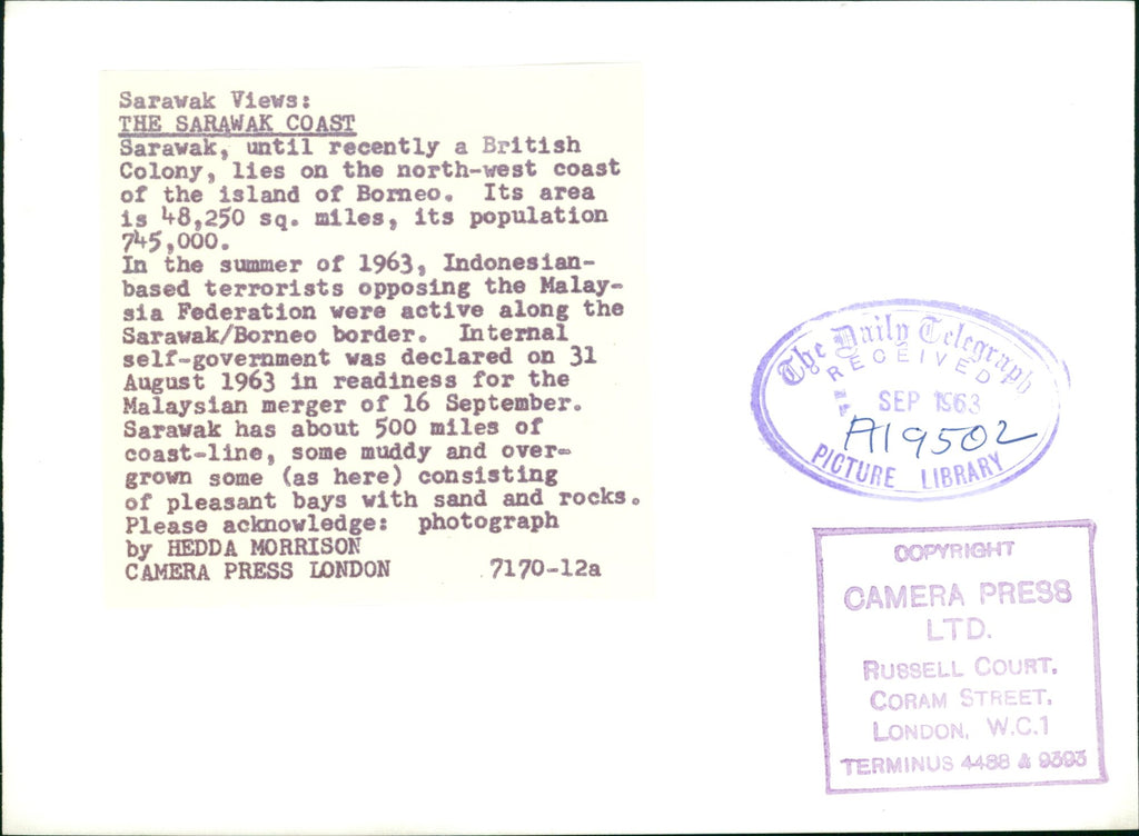 Sawarak, until recently a British Colony, lies on the North-west coast of the island of Borneo. Its area is 48,250 sq. miles, its population 745,000. In the summer of 1963, Indonesian based terrorists opposing the Malaysia federation were active along the Sarawak/Borneo border. Internal self-government was declared on 31 August 1963 in readiness for the Malaysian merger of 16 September. Sawarak has about 500 miles of coast-line, some muddy and over grown some consisting of pleasant bays with sand and rocks. Sawarak, until recently a British Colony, lies on the North-west coast of the island of Borneo. Its area is 48,250 sq. miles, its population 745,000. In the summer of 1963, Indonesian based terrorists opposing the Malaysia federation were active along the Sarawak/Borneo border. Internal self-government was declared on 31 August 1963 in readiness for the Malaysian merger of 16 September. Sawarak has about 500 miles of coast-line, some muddy and over grown some consisting of pleasant bays with sand and rocks.