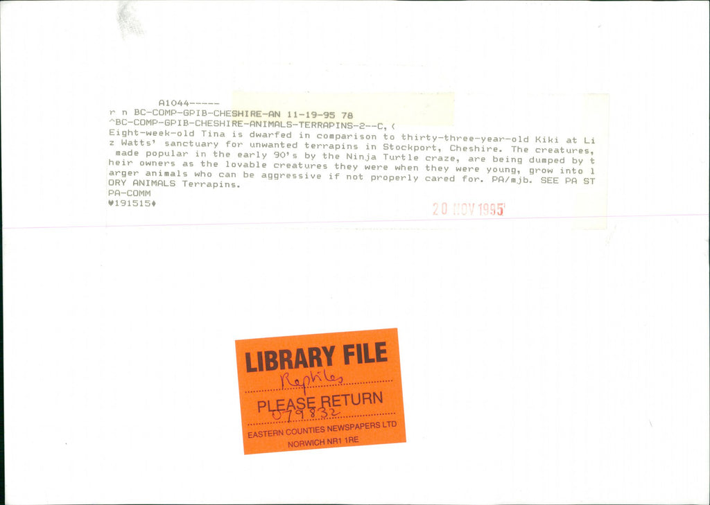 Eight week old Tina is dwarfed in comparison to thirty three year old kiki at Liz Watt's santuary for unwanted terrapins in stockport, Cheshire. Eight week old Tina is dwarfed in comparison to thirty three year old kiki at Liz Watt's santuary for unwanted terrapins in stockport, Cheshire.