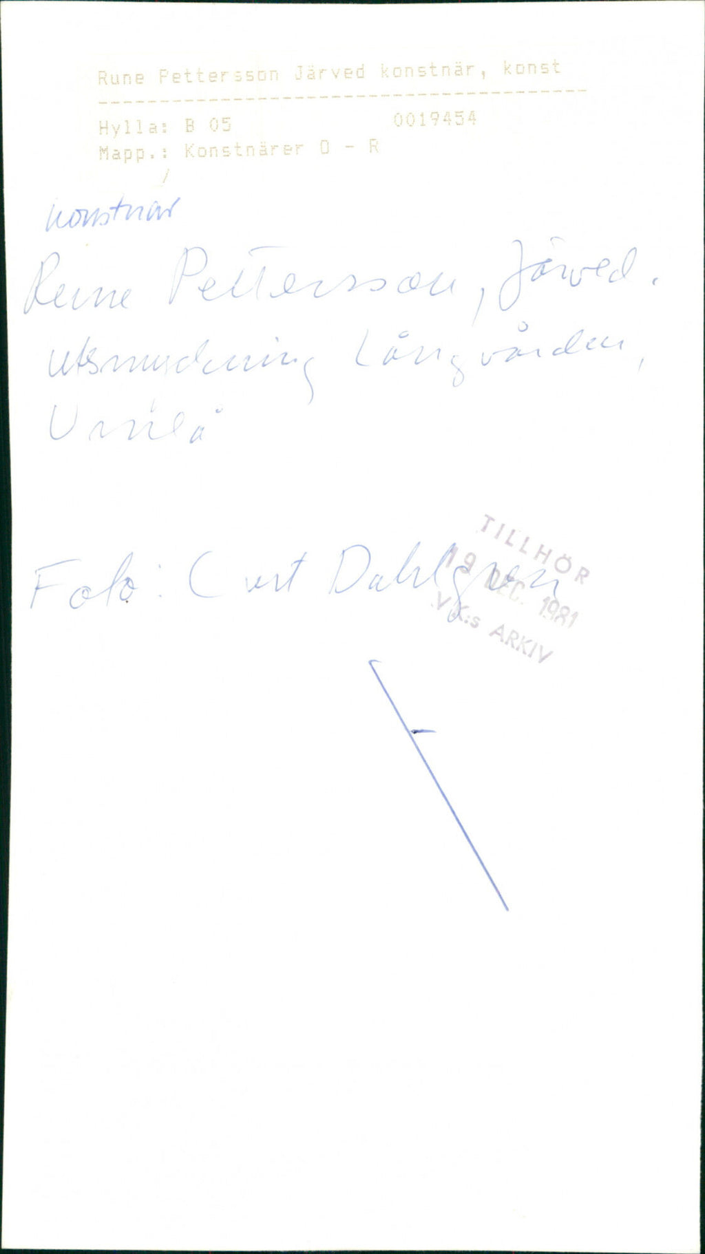 1981 KATNR KONSTNAR JAWED PETTERSSON FOLDER RUNE JARVED OLO TIH Porträtt på konstnär Rune Pettersson från Järved