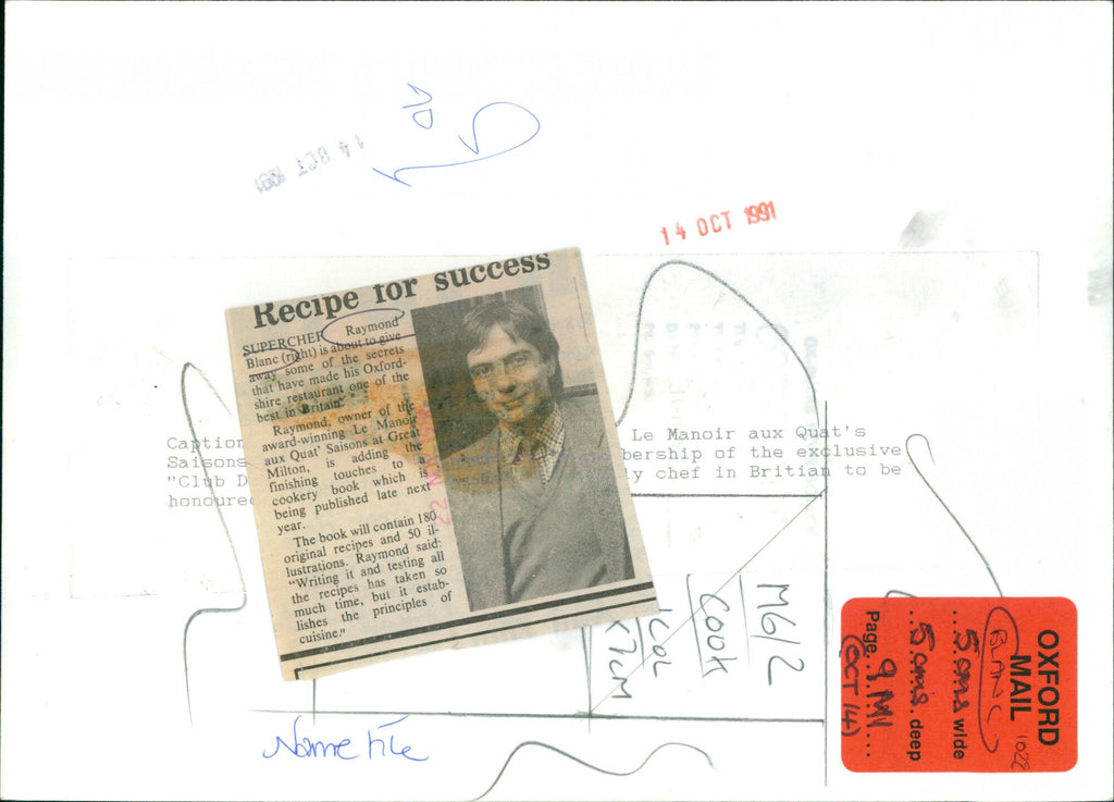 OV 14 OCT 1991 Recipe for success Le Manoir aux Quats Bership of the exclusive club chef in Britain to be honour. SUPERCHER Raymond Blanc (right) is about to give away some of the secrets that have made his Oxfordshire restaurant one of the best in Britain. Raymond, owner of the Saisons aux Quat Saisons at Great award-winning Le Manoir is adding the finishing touches to a cookery book which is being published late next year. The book will contain 180 original recipes and 50 illustrations. Raymond said: Writing it and testing all the recipes has taken so much time, but it establishes the principles of cuisine. OV 14 OCT 1991 Recipe for success Le Manoir aux Quats Bership of the exclusive club chef in Britain to be honour. SUPERCHER Raymond Blanc (right) is about to give away some of the secrets that have made his Oxfordshire restaurant one of the best in Britain. Raymond, owner of the Saisons aux Quat Saisons at Great award-winning Le Manoir is adding the finishing touches to a cookery book which is being published late next year. The book will contain 180 original recipes and 50 illustrations. Raymond said: Writing it and testing all the recipes has taken so much time, but it establishes the principles of cuisine.