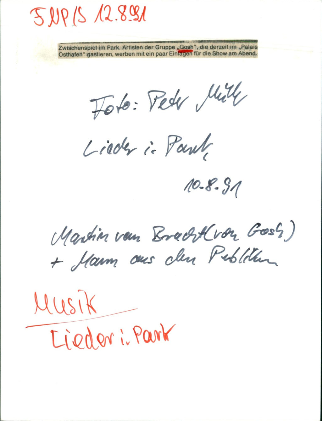 Interplay in the park. Artists of the group "Gosh", which are currently in the "Palais Ostafen", advertise with a few deposits for the show in the evening. 10.8.91 Zwischenspiel im Park. Artisten der Gruppe "Gosh", die derzeit im "Palais Osthafen" gastieren, werben mit ein paar Einlagen für die Show am Abend. 10.8.91