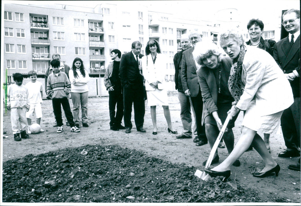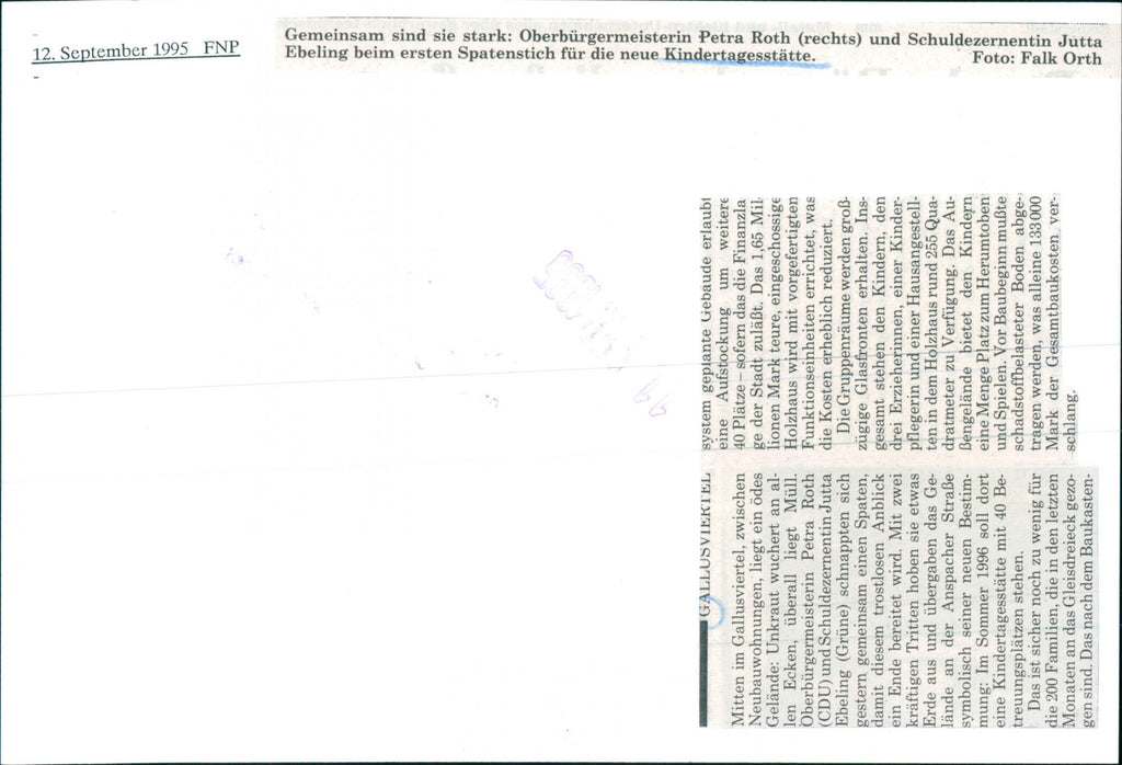Ebeling at the first groundbreaking ceremony for the new day care center. Together they are strong: Lord Mayor Petra Roth (right) and School Discount Jutta Ebeling (left) mark the first spades. September 12, 1995 Ebeling beim ersten Spatenstich für die neue Kindertagesstätte. Krabbelstuben, Kinderkeller, Spielhäuser, Kinder-Schülerläden, Spiel- und Lernstuben, U.