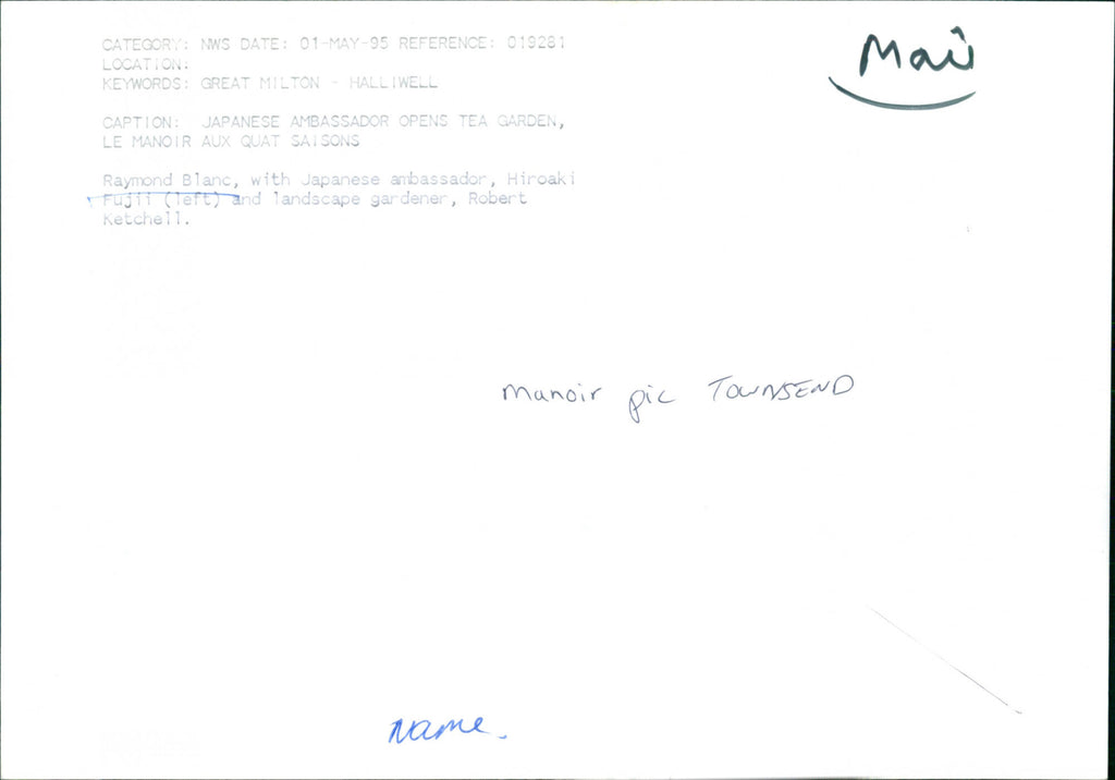 01-MAY-95. JAPANESE AMBASSADOR OPENS TEA GARDEN. Raymond Blanc, with Japanese ambassador, Hiroaki Fujii (right) and landscape gardener, Robert Townsend. 01-MAY-95. JAPANESE AMBASSADOR OPENS TEA GARDEN. Raymond Blanc, with Japanese ambassador, Hiroaki Fujii (right) and landscape gardener, Robert Townsend.