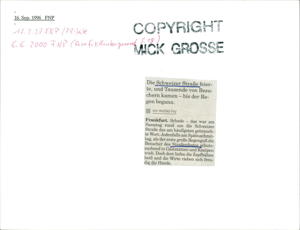 6.6.2000: The Swiss street celebrated, and thousands of visitors came - until the rain began. From Wiebke Fey, Frankfurt. Too bad - that was the most common used word on Saturday around the Swiss street. Anyway, in the late afternoon, as the first major rain gate driving the searching in restaurants and pubs. But there the tap taps were hot and the hosts joyfully raced his hands. 6.6.2000: Die Schweizer Straße feierte, und Tausende von Besuchern kamen - bis der Regen begann. Von Wiebke Fey, Frankfurt. Schade - das war am Samstag rund um die Schweizer Straße das am häufigsten gebrauchte Wort. Jedenfalls am Spätnachmittag, als der erste große Regenguß die suchend in Gaststätten und Kneipen trieb. Doch dort liefen die Zapfhähne heiß und die Wirte rieben sich freudig die Hände.
