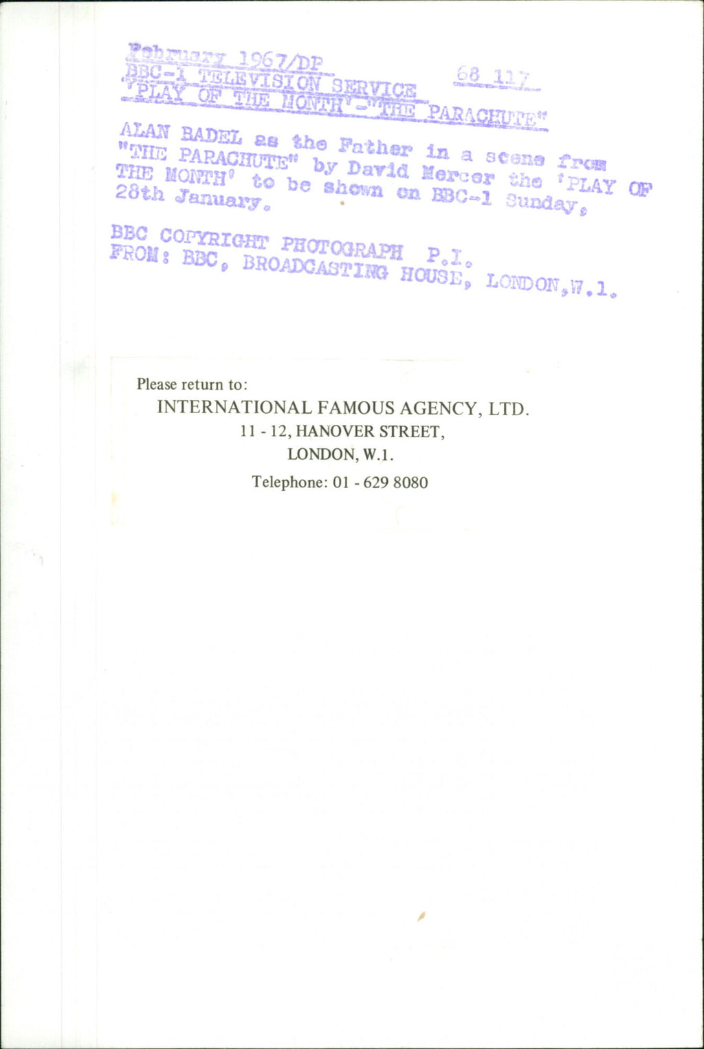Alan Badel as the Father in a scene from "The Parachute" by David Mercer the "Play of the Month" to be shown on BBC-1. Alan Badel as the Father in a scene from "The Parachute" by David Mercer the "Play of the Month" to be shown on BBC-1.