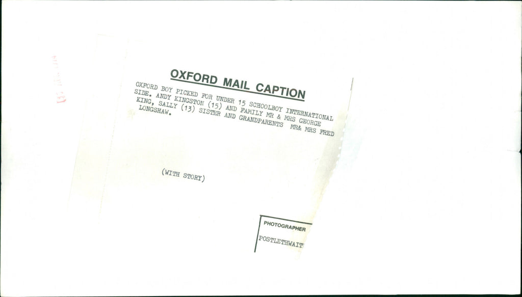 Oxford boy picked for under 15 schoolboy International side. Andy Kingston (15) and Family Mr. and Mrs. George King, Sally (13) sister and grandparents Mr. and Mrs. Fred Longshaw. Oxford boy picked for under 15 schoolboy International side. Andy Kingston (15) and Family Mr. and Mrs. George King, Sally (13) sister and grandparents Mr. and Mrs. Fred Longshaw.