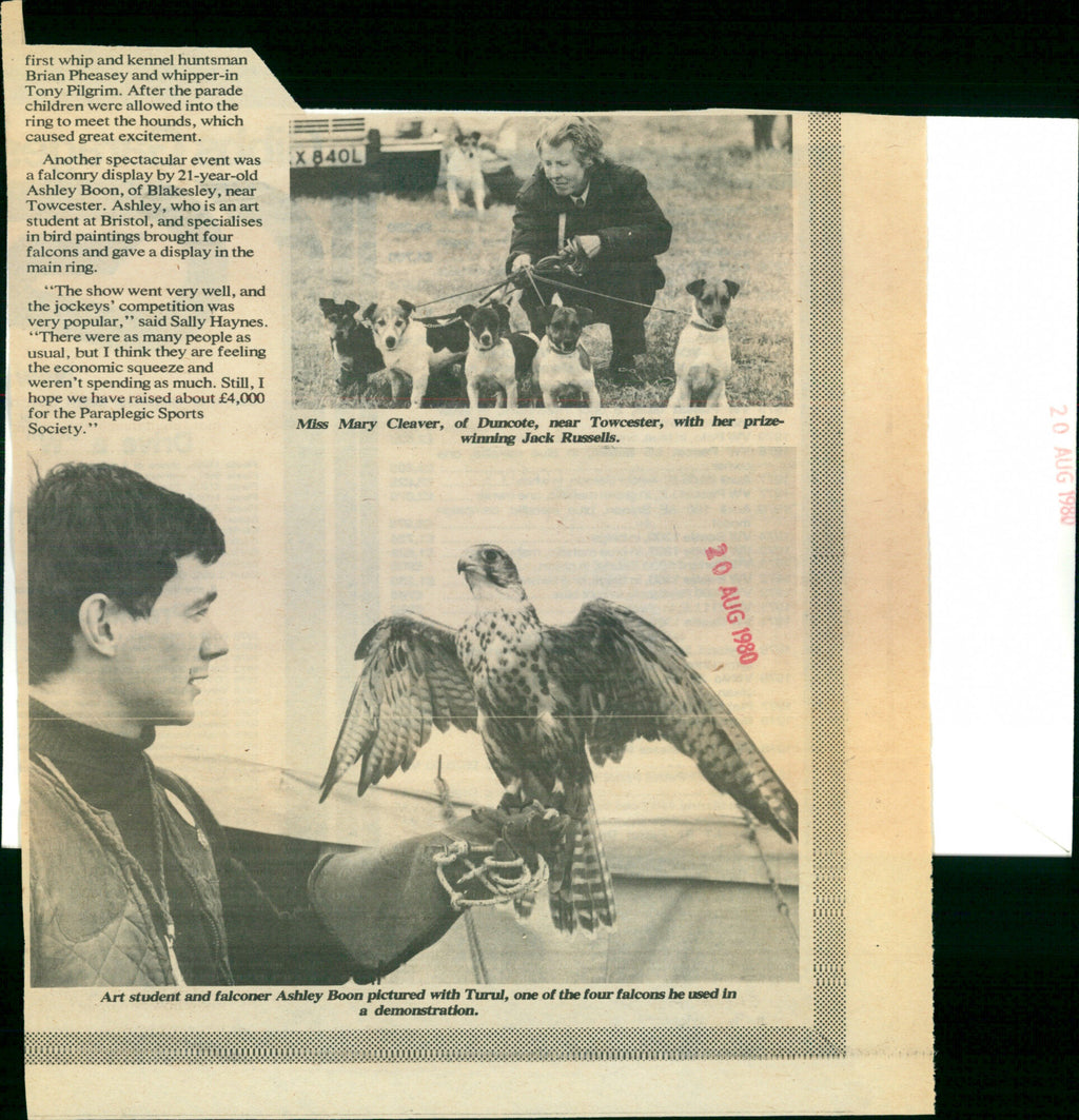 Art student and falconer Ashley Boon with Turul, one of the four falcons he used in demonstration. Art student and falconer Ashley Boon with Turul, one of the four falcons he used in demonstration.