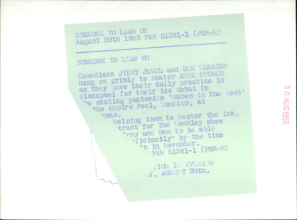 Comedian Jimmy Jewel and Ben Warriss hang on grimly to skater Anne Storer as they have their daily practice in Blackpool for their ice debut in the skating pantomime 'Babes in the Wood'. Comedian Jimmy Jewel and Ben Warriss hang on grimly to skater Anne Storer as they have their daily practice in Blackpool for their ice debut in the skating pantomime 'Babes in the Wood'.