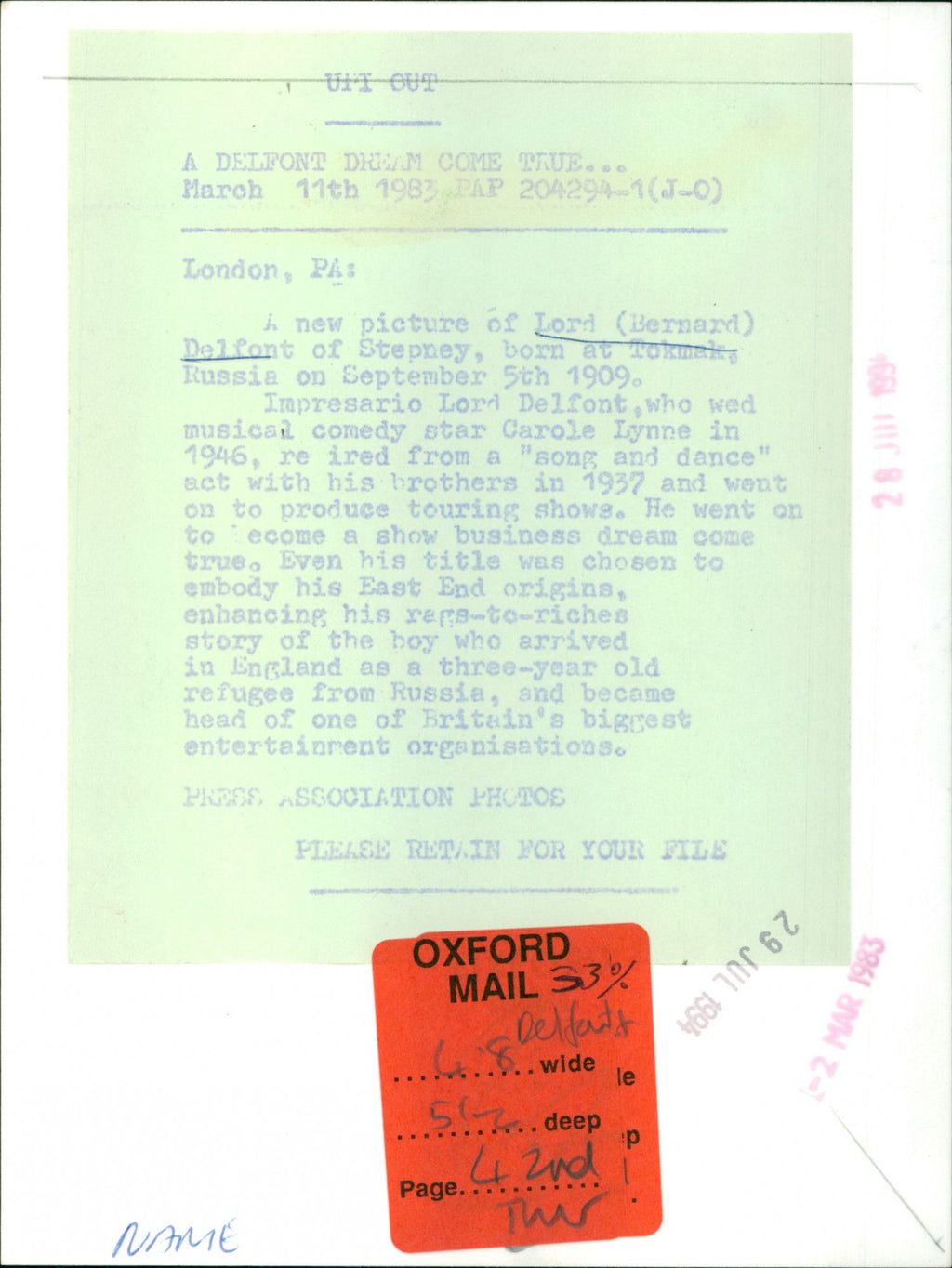 All our press photos are LIMITED ARCHIVE ORIGINALS - they are the actual prints that were used by the newspapers, they are not reprints or digital prints produced by us. All the prints are at least 30 years old and up to 100 years old.