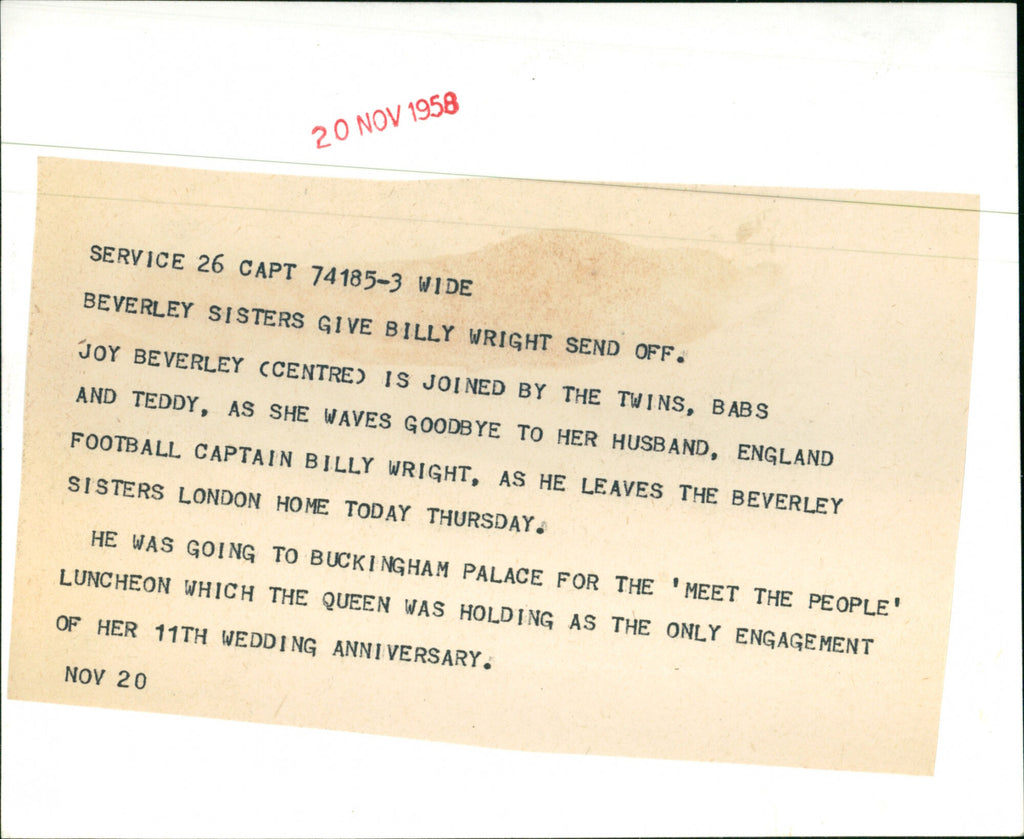 Joy Beverley (centre) is joined by the Twins, Babs and Teddie, as she waves goodbye to her husband, England Football Captain Billy Wright, as he leaves the Beverley sisters London home today Thursday. Joy Beverley (centre) is joined by the Twins, Babs and Teddie, as she waves goodbye to her husband, England Football Captain Billy Wright, as he leaves the Beverley sisters London home today Thursday.