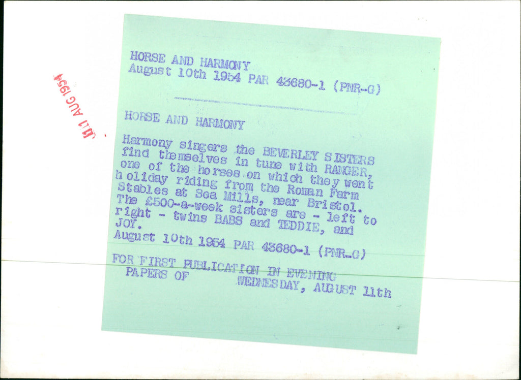 Harmony singers the Beverley Sisters find themselves in tune with Ranger, one of the horses on which they went holiday riding from the Roman Farm Stables at Sea Mills, near Bristol. left to right: Twins Babs and Teddie and Joy Harmony singers the Beverley Sisters find themselves in tune with Ranger, one of the horses on which they went holiday riding from the Roman Farm Stables at Sea Mills, near Bristol. left to right: Twins Babs and Teddie and Joy