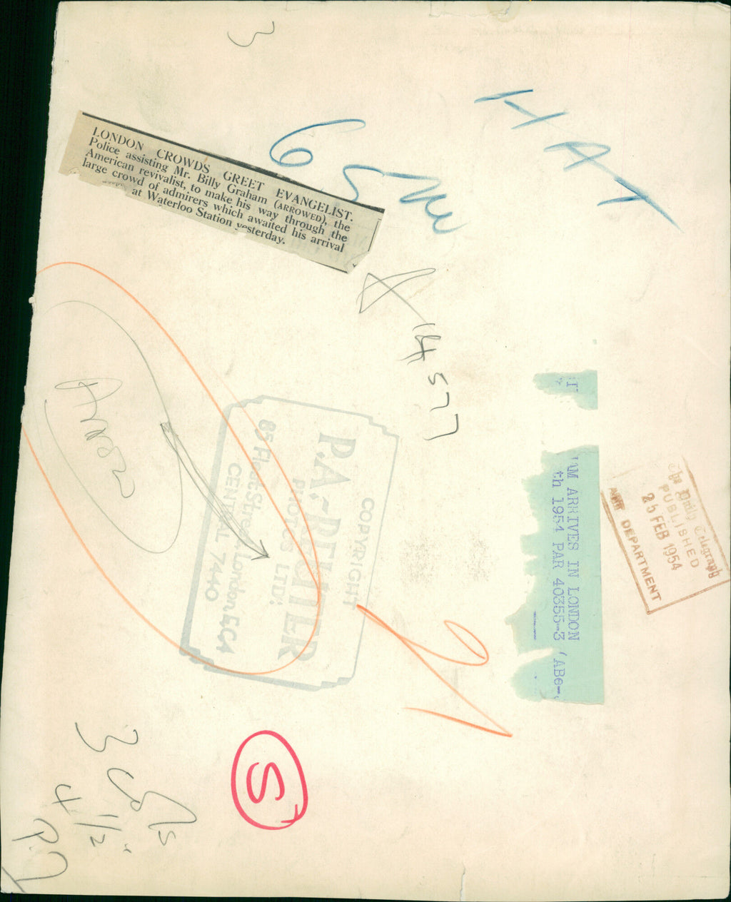 London crowds greet evangelist. Police assisting Billy Graham (arrowed), the American revivalist, to make his way through the large crowd of admirers which awaited his arrival at Waterloo Station. London crowds greet evangelist. Police assisting Billy Graham (arrowed), the American revivalist, to make his way through the large crowd of admirers which awaited his arrival at Waterloo Station.