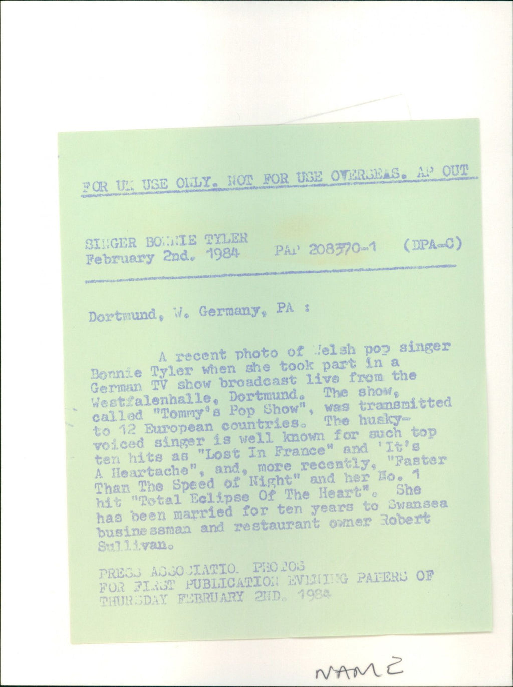 All our press photos are LIMITED ARCHIVE ORIGINALS - they are the actual prints that were used by the newspapers, they are not reprints or digital prints produced by us. All the prints are at least 30 years old and up to 100 years old.
