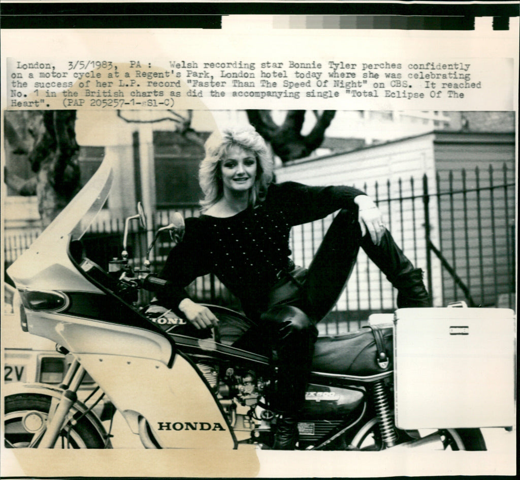 Welsh recording star Bonnie Tyler perches confidently an a motorcycle at a Regent's Park, London hotel where she was celebrating the success of her L.P. record "Faster Than The Speed of Night" on CBS. Welsh recording star Bonnie Tyler perches confidently an a motorcycle at a Regent's Park, London hotel where she was celebrating the success of her L.P. record "Faster Than The Speed of Night" on CBS.