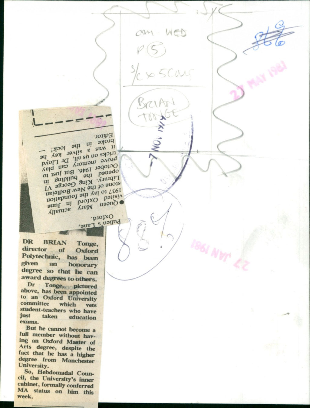 Dr. Brian Tonge, director of Oxford Polytechnic, has been given an honorary degree so that he can award degrees to others. Dr. Brian Tonge, director of Oxford Polytechnic, has been given an honorary degree so that he can award degrees to others.
