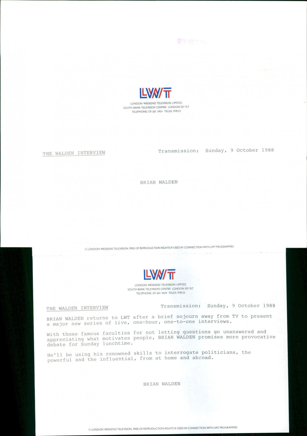 Brian Walden returns to LWT after a brief sojourn away from TV to present a major new series of live, one-hour, one-to-one interview. Brian Walden returns to LWT after a brief sojourn away from TV to present a major new series of live, one-hour, one-to-one interview.