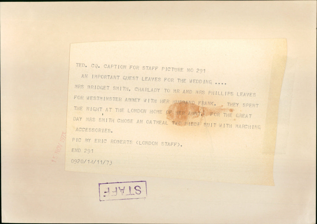 Bridget Smith, Charlady to Mr. and Mrs. Mark Phillips, leaves for the royal wedding Bridget Smith, Charlady to Mr. and Mrs. Mark Phillips, leaves for the royal wedding
