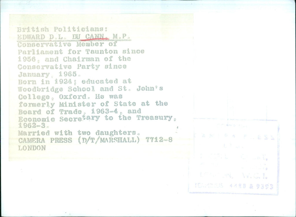 Edward D.L. Du Cann is a Conservative Member of Parliament for Taunton since 1956 and Chairman of the Conservative Party since January 1965. He was born in 1924 and educated at Woodbridge School and St. John's College, Oxford. Previously, he served as Minister of State at the Board of Trade from 1963-1964 and Economic Secretary to the Treasury from 1962-1963. He is married with two daughters. Edward D.L. Du Cann is a Conservative Member of Parliament for Taunton since 1956 and Chairman of the Conservative Party since January 1965. He was born in 1924 and educated at Woodbridge School and St. John's College, Oxford. Previously, he served as Minister of State at the Board of Trade from 1963-1964 and Economic Secretary to the Treasury from 1962-1963. He is married with two daughters.
