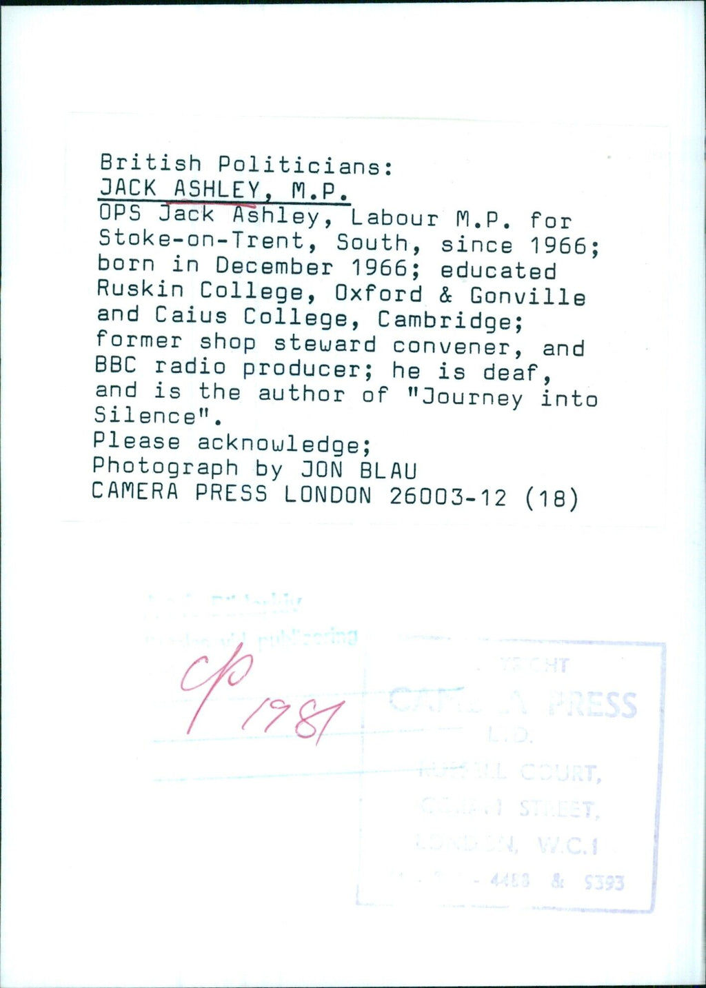 British Politician Jack Ashley, M.P. British Politician Jack Ashley, M.P.