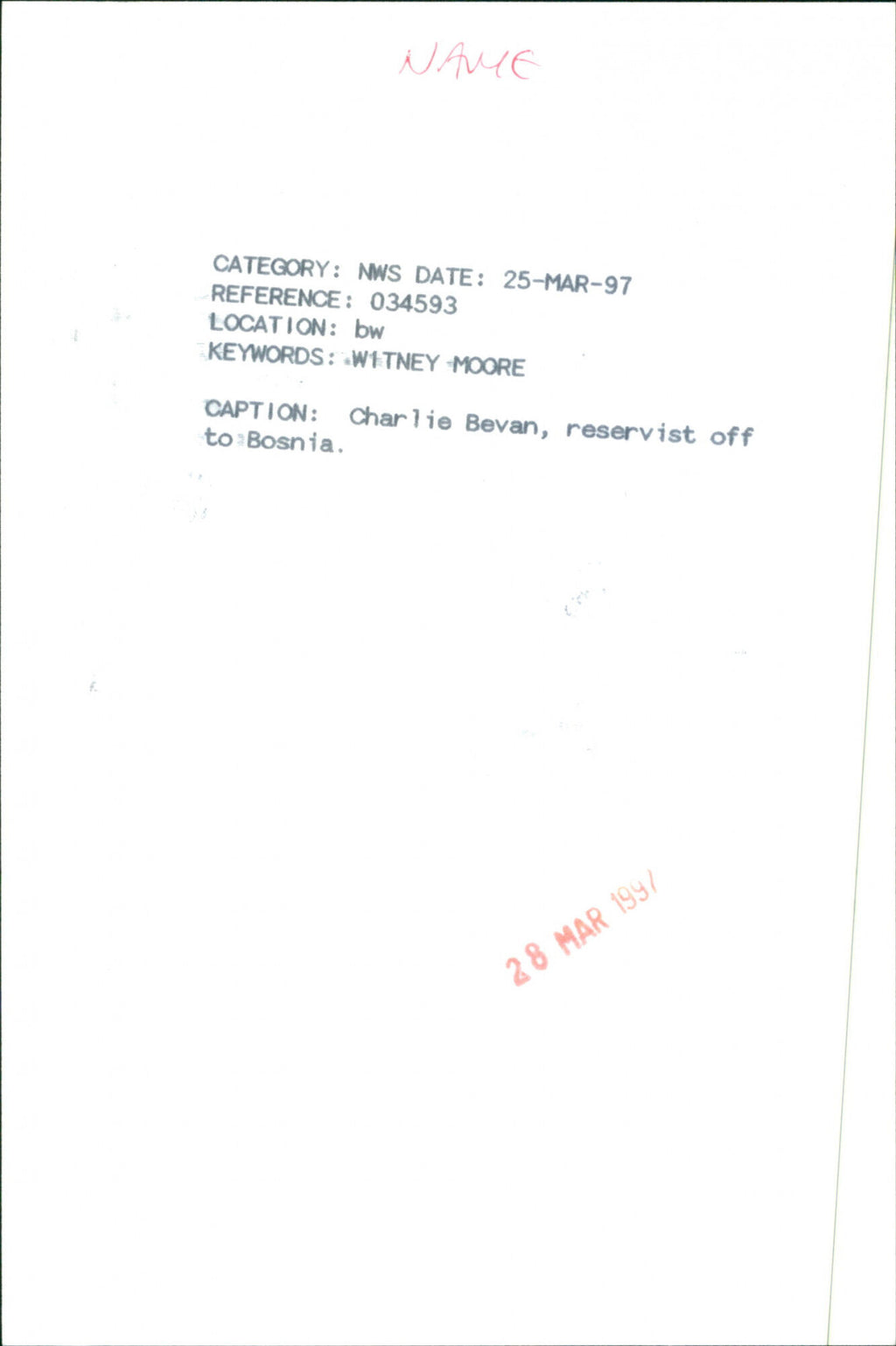 Charlie Bevan, reservist off to Bosnia. Charlie Bevan, reservist off to Bosnia.