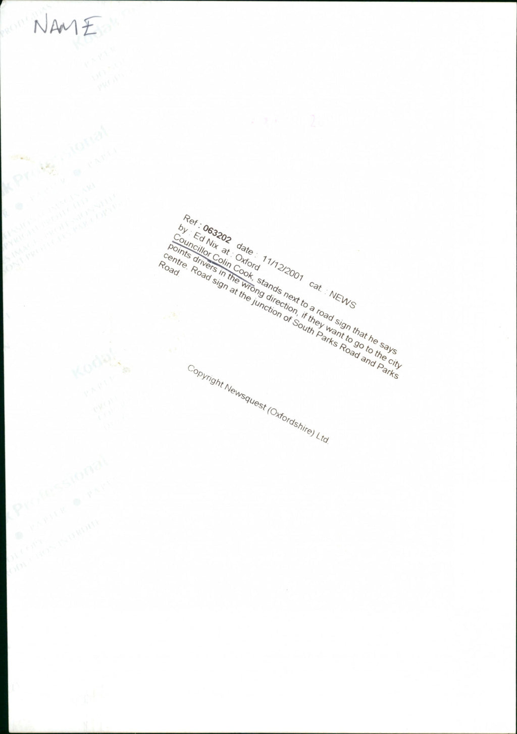 Councilor Colin Cook, stands next to a road sign that he says points drivers in the wrong direction, if they want to go to the city center. Road sign at the junction of South Parks Road and Parks Road. Councilor Colin Cook, stands next to a road sign that he says points drivers in the wrong direction, if they want to go to the city center. Road sign at the junction of South Parks Road and Parks Road.