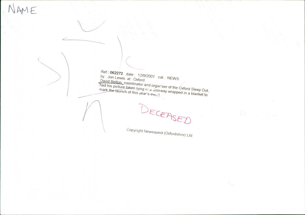 David Belton coordinator and organiser of the Oxford Sleep Out, had his picture taken lying in a doorway wrapped in a blanket to mark launch of the event. David Belton coordinator and organiser of the Oxford Sleep Out, had his picture taken lying in a doorway wrapped in a blanket to mark launch of the event.