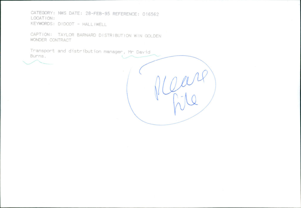 Transport and distribution manager, Mr. David Burns. Taylor Barnard Distribution win Golden Wonder Contract. Transport and distribution manager, Mr. David Burns. Taylor Barnard Distribution win Golden Wonder Contract.