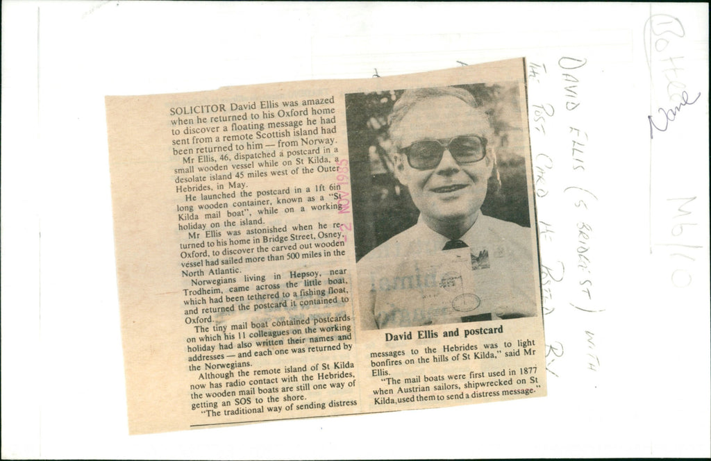 Solicitor David Ellis wa amazed when he returned home to his Oxford home to discover a floating message he had sent from a remote Scottish Island had been returned to him. Solicitor David Ellis wa amazed when he returned home to his Oxford home to discover a floating message he had sent from a remote Scottish Island had been returned to him.